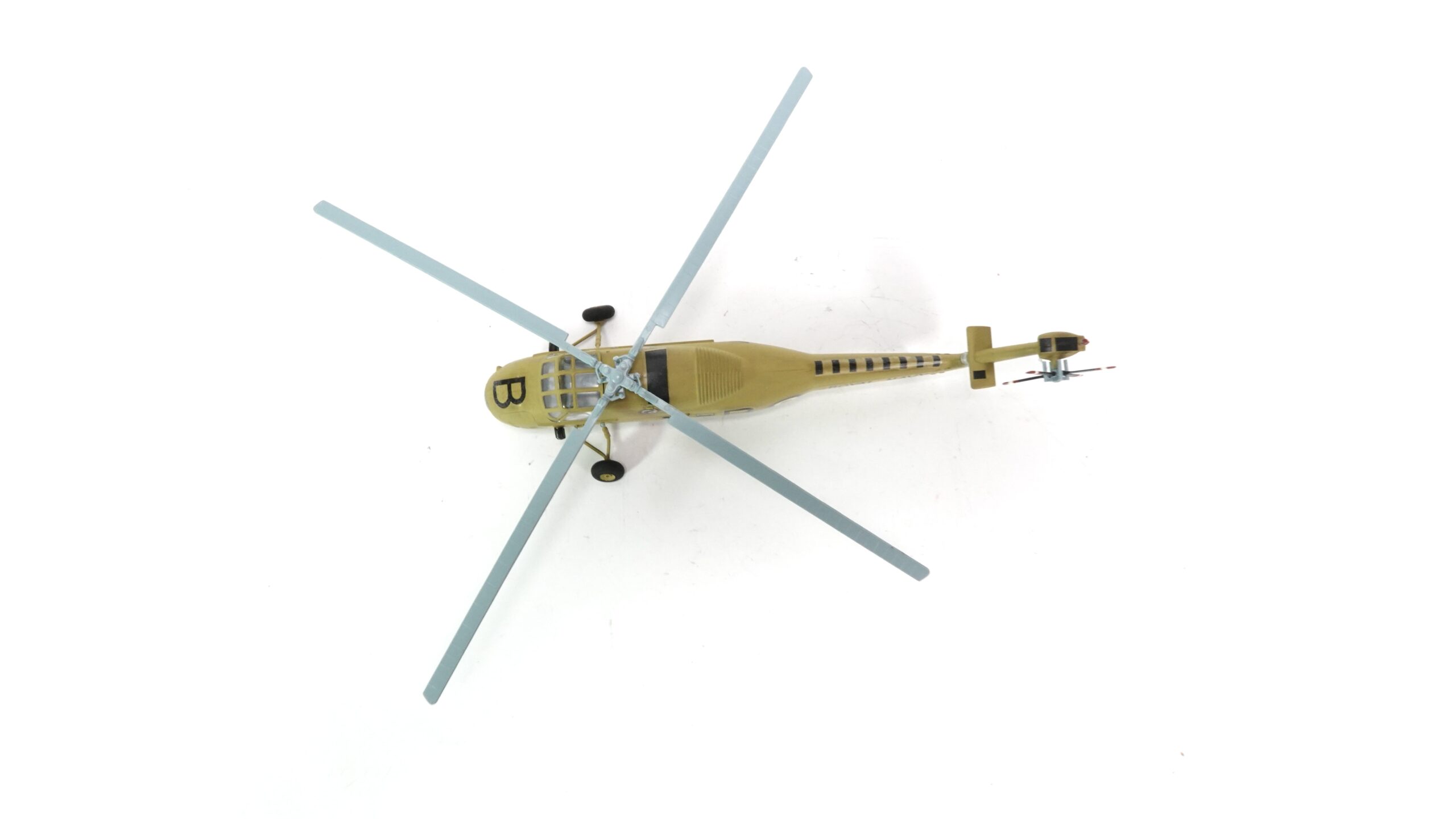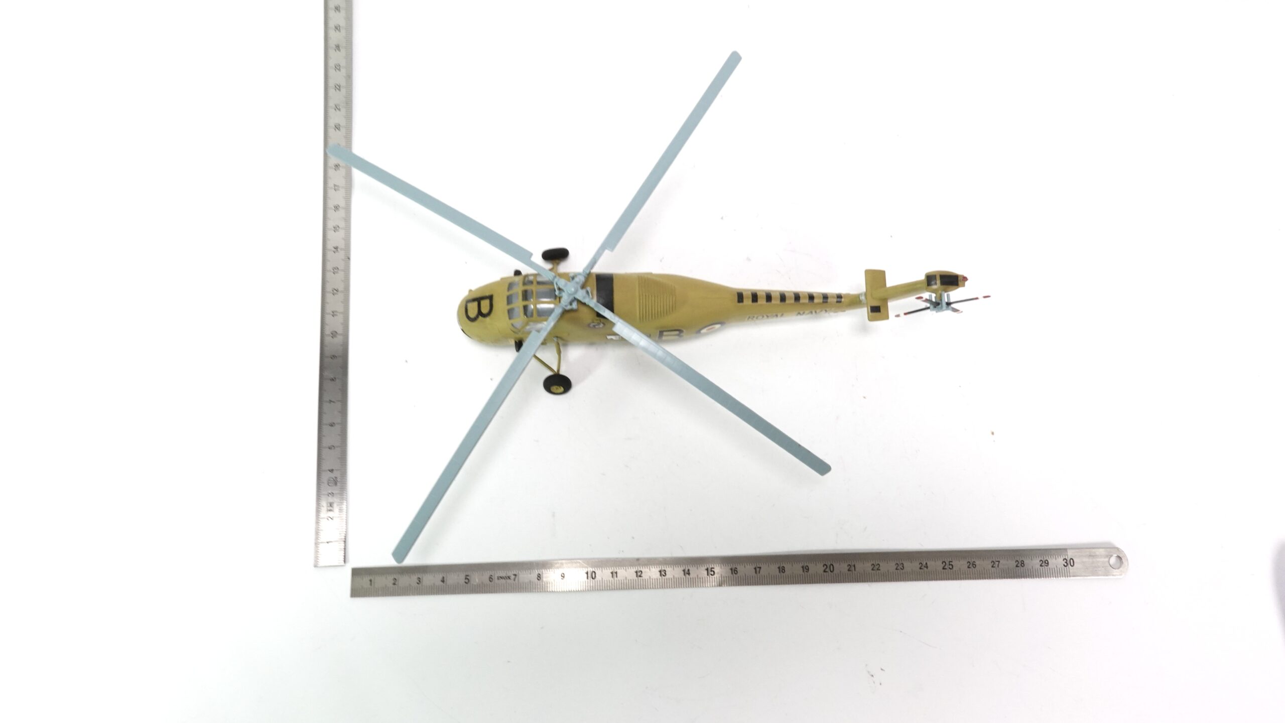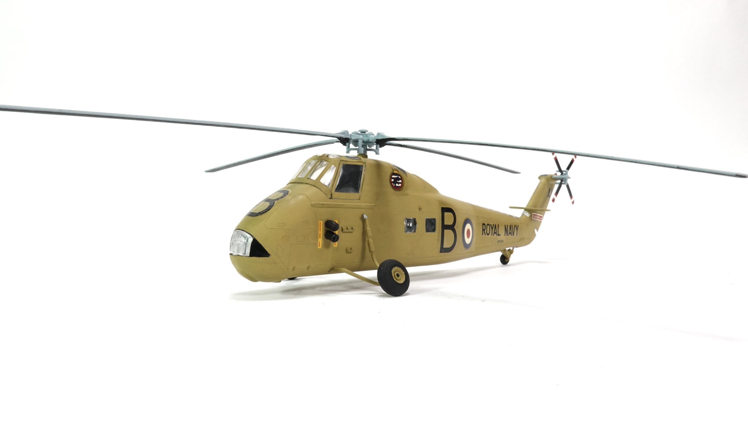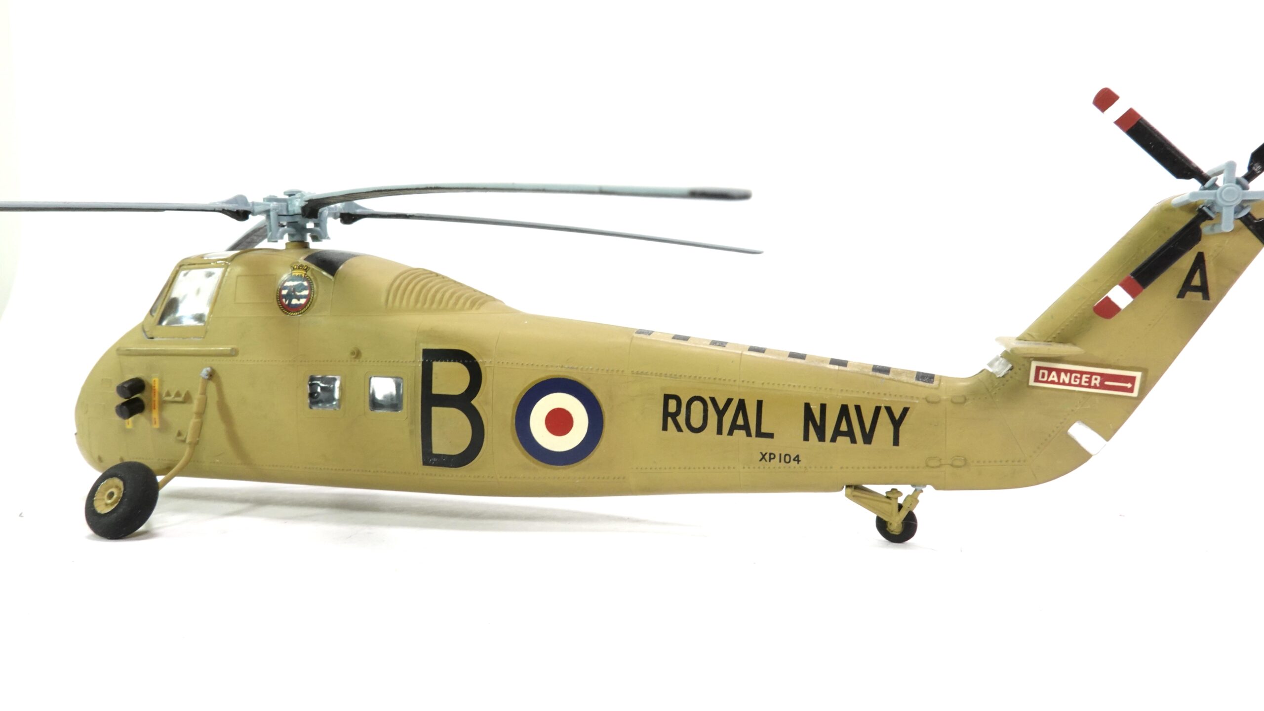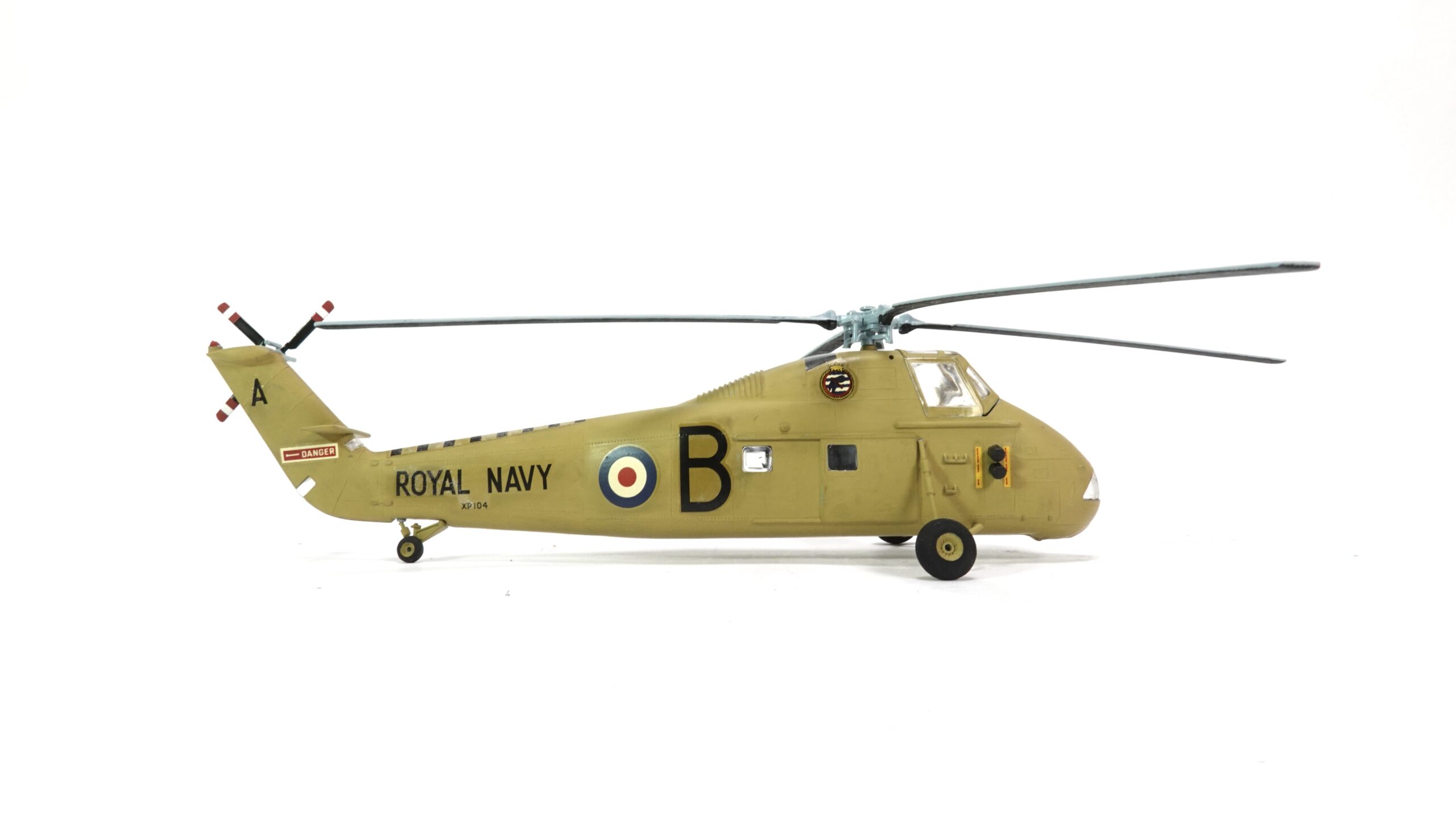 Das hier präsentierte Modell im Maßstab 1:72 zeigt die Maschine mit der Betriebsnummer XP104, markiert mit einem großen „B“ an der Nase und dem Kennzeichen „A“ am Leitwerk. Die auffällige sandgelbe Lackierung ist ein Hinweis auf den Einsatz in wärmeren Regionen – vermutlich im Mittelmeerraum oder Nahen Osten, wo die Royal Navy ihre Helikopterflotte gern auch von Flugzeugträgern aus operieren ließ.